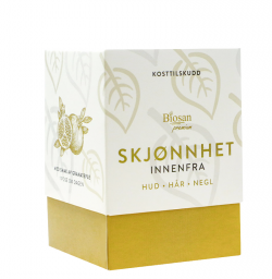 - Biosan Skjønnhet tilfører huden hele 5000 mg norsk kollagen daglig som er med på å forsinke hudens aldringstegn, og hyaluronsyre som binder fuktighet til huden.
